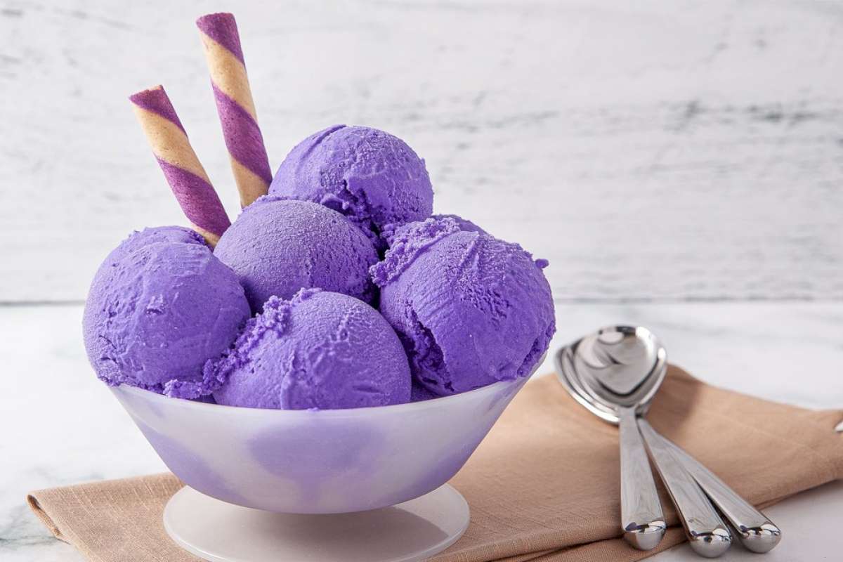 Kem khoai môn có màu tím nhìn thật đẹp mắt. Khi ăn, kem có hương thơm nhẹ của khoai môn, vị béo, độ ngọt vừa phải, mềm mịn. Với món kem này sẽ rất thích hợp vào những ngày hè nắng nóng oi bức đấy!