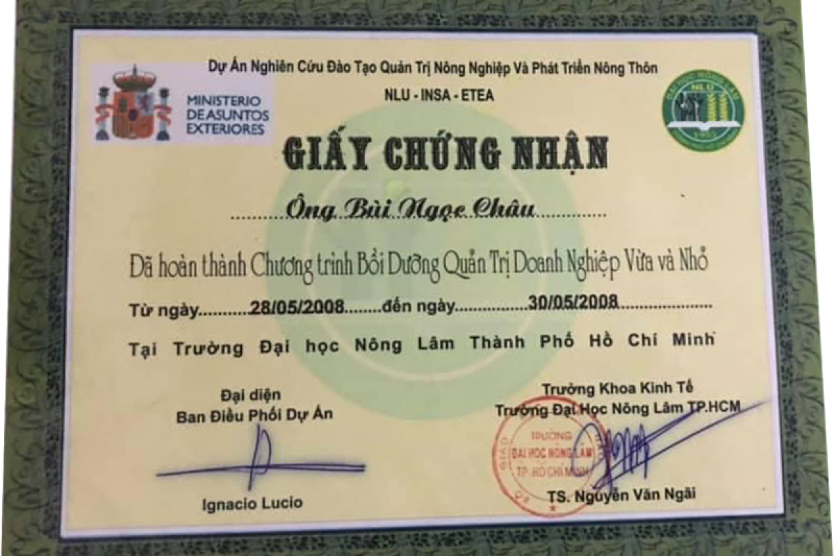 Giấy Chứng Nhận Ông Bùi Ngọc Châu Đã Hoàn Thành Chương Trình Bồi Dưỡng Quản Trị Doanh Nghiệp Vừa và Nhỏ